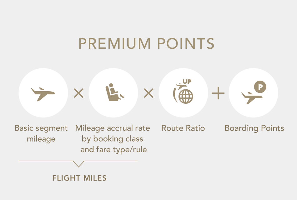 Premium Points is accrued in a separate category from mileage. Premium Points are earned to determine the premium member status. The number of points are calculated from the base segment mileage, the accrual rate based on ticketed booking class and fare type, the route ratio and boarding points. Points will be credited to you each time you fly.