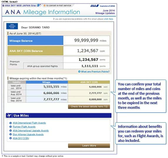 Statements (Mileage Balance, ANA SKY COIN Balance) will be sent each month by e-mail to customers who have a balance of 1 or more miles in their mileage account at the end of the previous month.