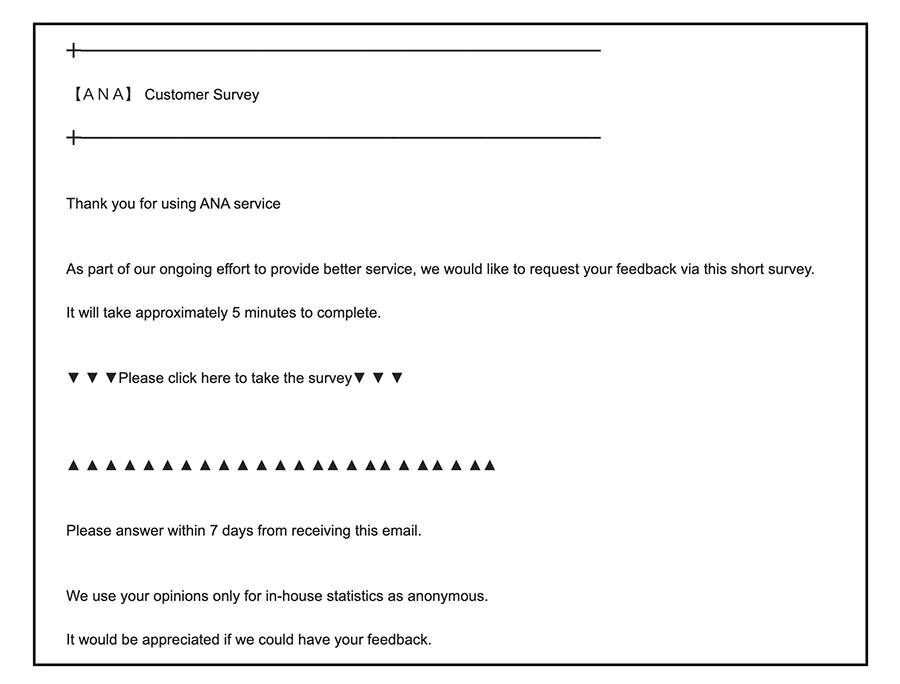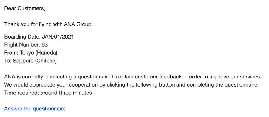 Customers who use a flight or contact ANA to make an inquiry will receive a survey invitation email (or SMS message).