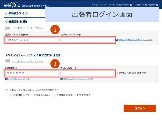 「出張者ログイン」の場合と「管理者ログイン」の場合、またANA マイレージクラブ会員でログインした場合と会員ログインをしていない場合で、表示される項目に一部違いがあります。