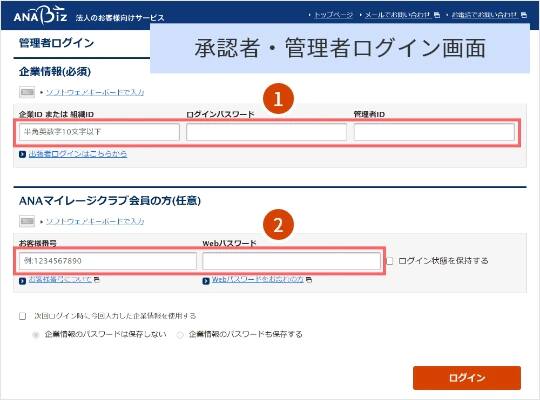 ANA Biz利用開始のご案内メールに表示された「企業ID」「管理者ID」とお申し込み時に申請登録した「ログインパスワード」でログインし、各種設定登録をしてください。