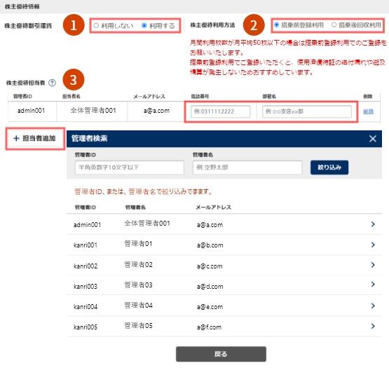 株主優待割引運賃を利用するか、制限するかや株主優待の利用方法を設定します。「搭乗後回収利用」を選択した場合は、株主優待番号ご案内書を毎月郵送いただく担当者を登録してください。(担当者は必ず1名の登録が必要です。)