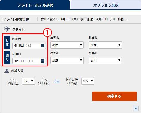 (1)全体の日程で行きと帰りのフライトを検索