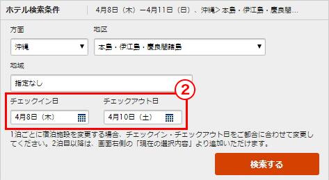 例)チェックイン:4/8 チェックアウト:4/10