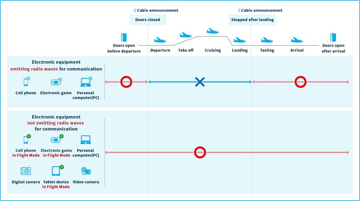 Upon departure, electronic devices which emit radio waves are not permitted to be used from when the doors close until the aircraft finishes the landing roll after landing. When the aircraft doors close, please set your device to not emit radio waves, or turn off the power. The cabin attendants will make an announcement to notify the passengers.