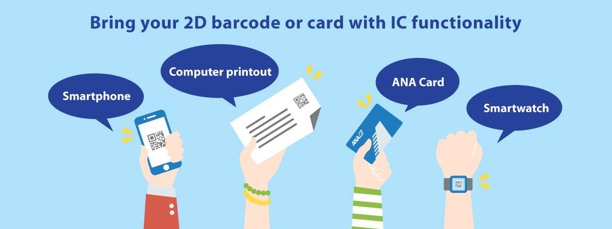 Upon reserving/purchasing your flight ticket and making your seat reservation on the ANA website, prepare the item you will need for boarding (barcode or card with IC functionality, etc.) to take with you. After arriving at the airport, skip check-in and proceed straight to security. At security, scan your barcode or card with IC functionality, etc. on the reader and then pass through. Use the same item to pass through the boarding gate. If you have changed your seat or flight after passing through security, please touch the reader with your new boarding pass.