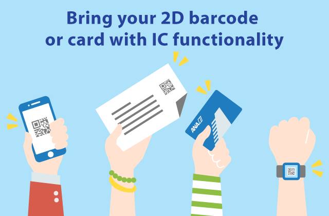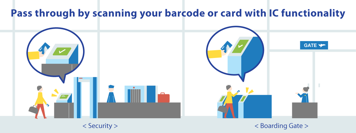 Please scan the relevant item on the reader at the baggage counter and check in your baggage. (Customers without baggage to check in can skip straight to security.) At security, please scan the relevant item and pass through. Use the same item to pass through the boarding gate.