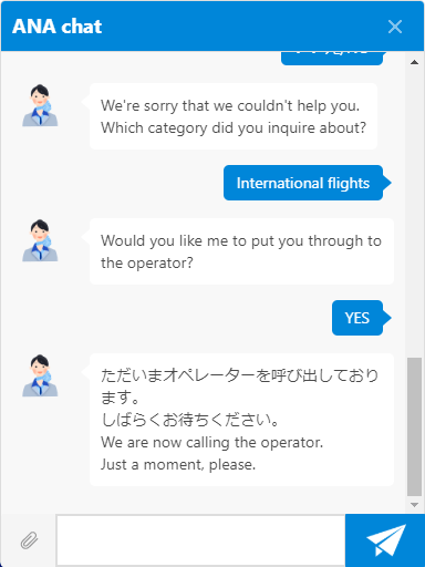 If you use ANA Chatbot during our telephone operator hours but do not find the helpful response provided via this function, a questionnaire for your inquiry category will be displayed.