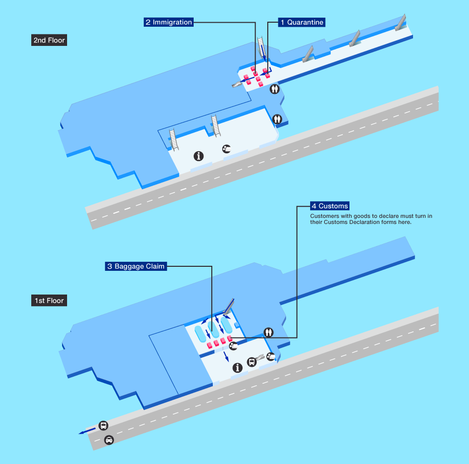 On the 2nd floor of the arrival terminal, there are quarantine and immigration booths. After passing through quarantine and immigration, go down to the 1st floor. On the 2nd floor, there are also toilets, an information counter, a currency exchange booth, and escalators. On the 1st floor, there is the baggage claim area and customs. At customs, please submit a customs declaration form. This form is required regardless of whether you have anything to declare. On the 1st floor, there is also an information counter, toilets, a currency exchange booth, and an escalator for the train station. Upon going out of the exit, you will find bus stops and taxi stands.
