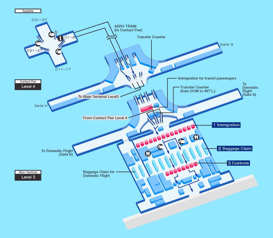 In the arrival satellite, there is an information counter, currency exchange booths, and escalators. Arriving passengers should take the Aerotrain to the Contact Pier. On level 4 of the Contact Pier, there are transfer counters. Go down to level 3 of the Main Terminal and pass through immigration, the baggage claim area, and then customs. On level 3, there are also immigration booths (for transit passengers), transfer counters (domestic to international flights), the baggage claim area for domestic flights, currency exchange booths, and toilets.