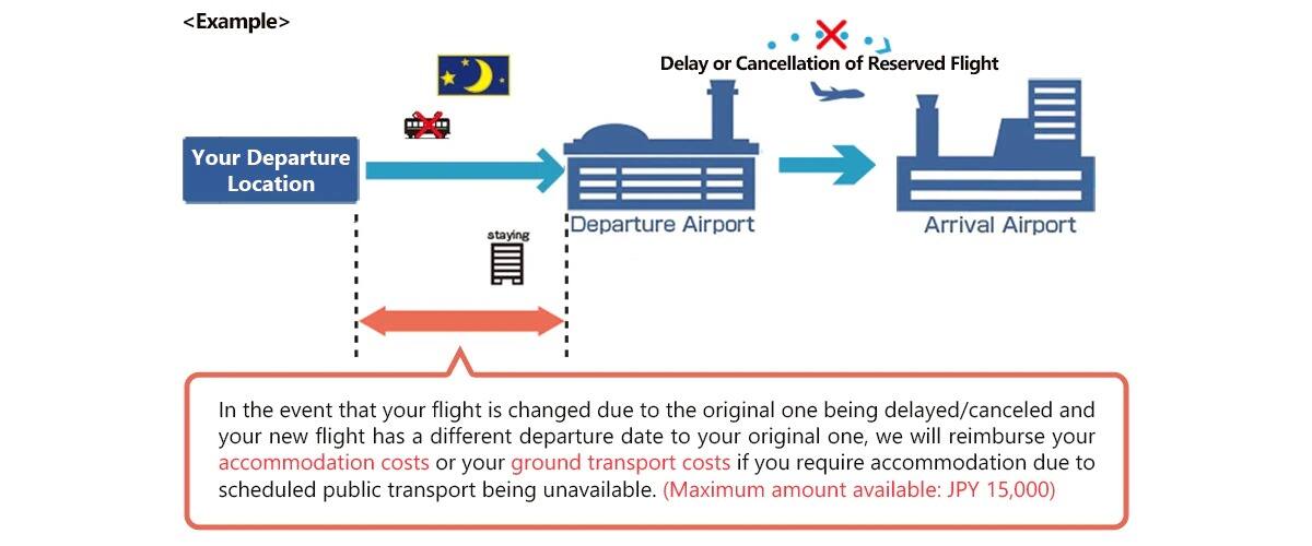 In the event that your flight is changed due to the original one being delayed/canceled and your new flight has a different departure date to your original one, we will reimburse your accommodation costs or your ground transport costs if you require accommodation due to scheduled public transport being unavailable. (Maximum amount available: JPY 15,000)