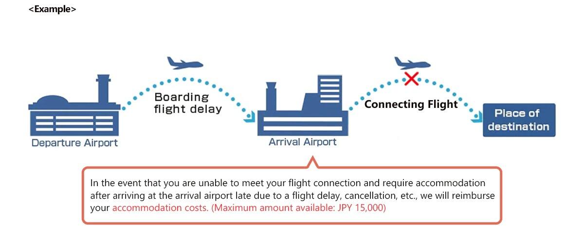 In the event that you are unable to meet your flight connection and require accommodation after arriving at the arrival airport late due to a flight delay, cancellation, etc., we will reimburse your accommodation costs. (Maximum amount available: JPY 15,000)