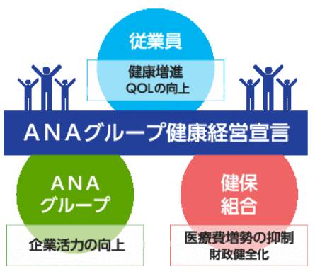 ANAグループ健康経営宣言 従業員に対しては健康増進、QOLの向上。ANAグループに対しては企業活力の向上。健保組合に対しては医療費増勢の抑制、財政健全化。