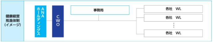 健康経営推進体制(イメージ) ANAホールディングスの配下にCWOを設置、CWOの配下の事務局が各社WLを管理する