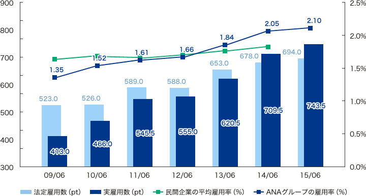 ANAグループでは、2012年にANA人事部に「グループ障がい者雇用推進室」を設置し、グループ全体での障がい者雇用の取り組みを本格化しました。各社のノウハウをグループ全体で共有しながら、『ANAグループ障がい者採用サイト』の新設、『ANAグループ合同面接会』の実施等によって採用競争力を高め、計画的に雇用を拡大してきました。