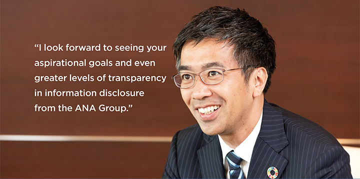 Kanie:Experiencing an event like the Olympic and Paralympic Games can change perceptions and society. I think companies can use the SDGs as an effective tool in corporate activities. For example, developing the air travel more accessible and stress-free makes your contribution to SDG 10, Reduce inequality within and among countries, more visible. I'm confident that more people will choose ANA for air travel and investment because of your efforts for sustainability. I also encourage you to track and disclose increases in passenger numbers, and changes in customer feedback toward the ANA Group.