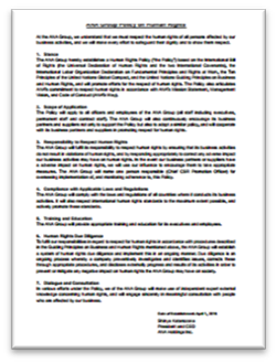 In April 2016, we established the ANA Group Policy on Human Rights. We based this policy on the International Bill of Human Rights (the Universal Declaration of Human Rights and two International Covenants), the International Labour Organization Declaration on Fundamental Principles and Rights at Work, the Ten Principles of the United Nations Global Compact, and the United Nations Guiding Principles on Business and Human Rights. In addition to this policy, the ANA Group has established the Social Responsibility Guidelines, a code of conduct that provides us with a clear understanding of what is expected of every Group executive and employee in relation to human rights.