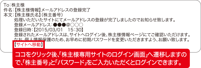 本登録ご案内メール2通目の【サイトへ移動】をクリック後、「株主様専用サイトのログイン画面」へ遷移しますので「株主番号」と「パスワード」をご入力いただくとログインできます。