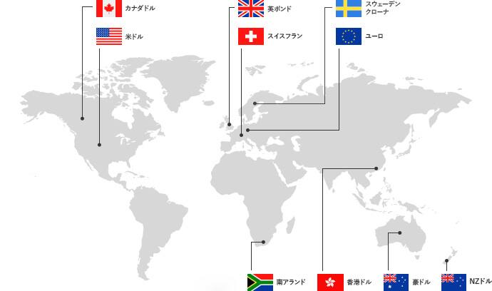 日本円のほか、米ドル、ユーロ、英ポンド、豪ドル、NZドル、カナダドル、スイスフラン、香港ドル、南アランド、スウェーデンクローナの10通貨が使えます。