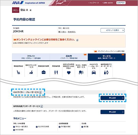 ANAウェブサイトから、航空券ご購入後の予約確認画面に表示される、オプショナルサービス内「ANAマイカー・バレーサービス」の「申し込む」ボタンよりご予約ください。