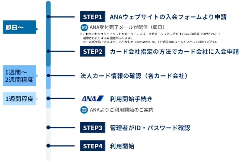 下記「ANA Biz(法人カード)」から内容をご確認の上、お申し込みください。ANAから受付完了メールが配信されます。