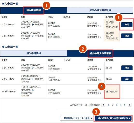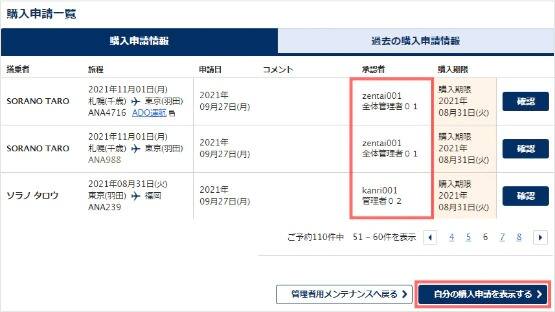 航空券を購入する場合、「承認者に購入申請を利用する」設定をしており、購入要求がされているものが一覧で表示されます。