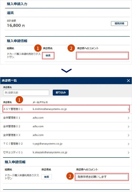購入申請をご利用の場合、購入手続きは承認者が申請内容を確認したうえで承認し手続きします。