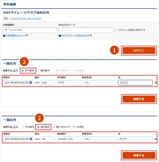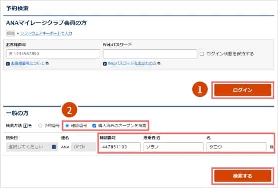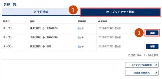 ANA Bizサイトにて購入済みの予約は、ANAウェブサイトからも検索できます。予約変更を伴う操作時は自動的にANA Bizサイトに遷移します。