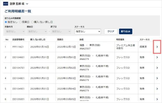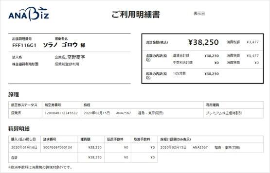 ANA Bizで購入した航空券の運賃や手数料の履歴と合計を出張者ごとの購入単位で確認することができる明細です。