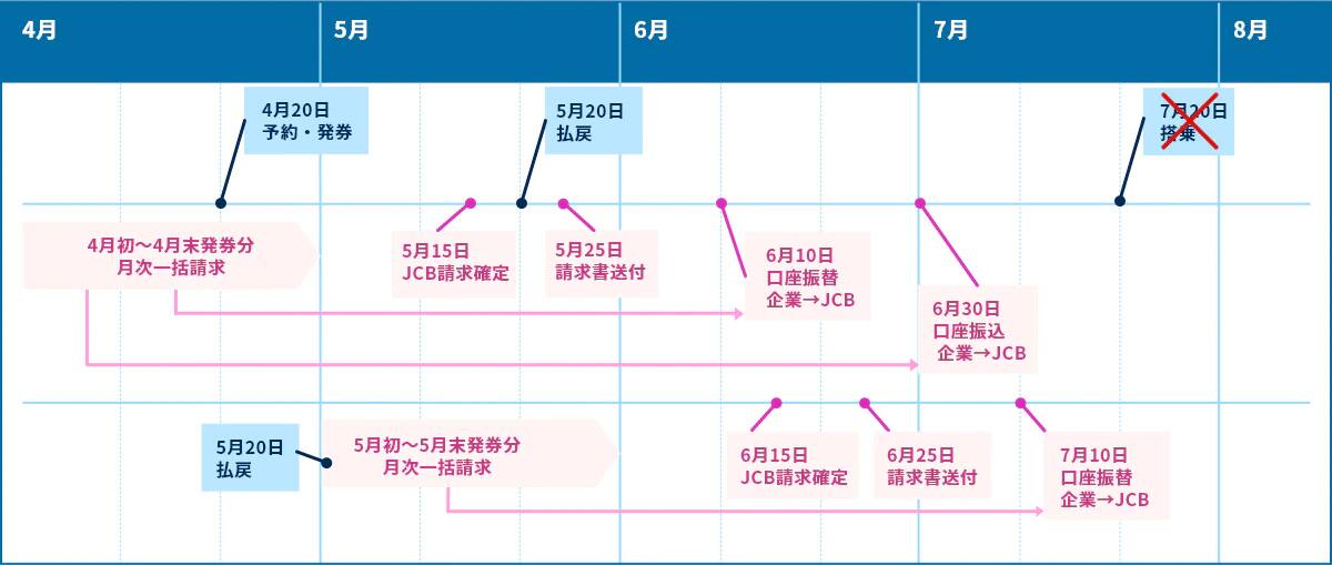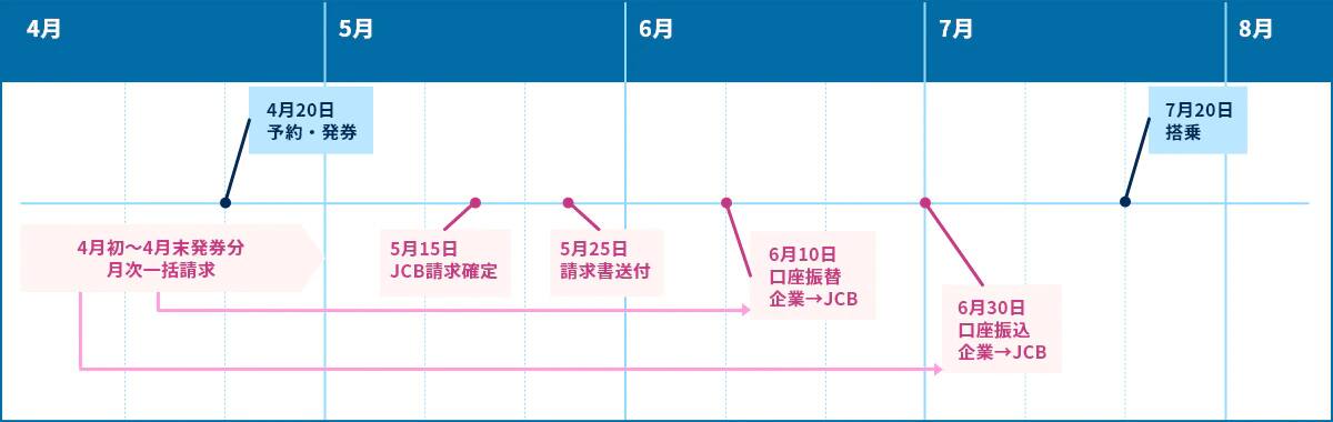 4月20日発券分は、4月1カ月分のご利用分として、翌月5月15日にJCBにて請求内容を確定後、5月25日頃請求書を発送いたします。