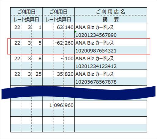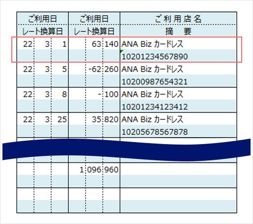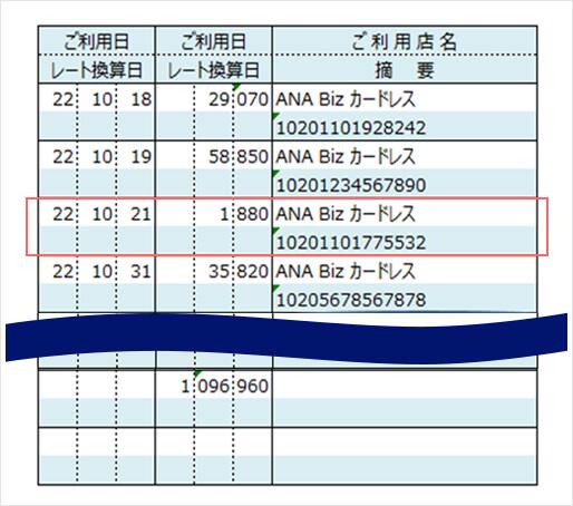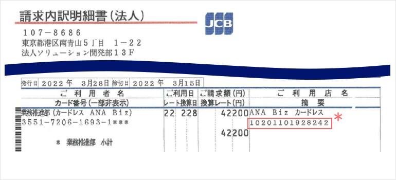 JCBからの請求内容の詳細を確認するには、摘要欄にある14桁の番号とANA Bizの請求番号を照合することでご利用者様の情報を確認することができます。