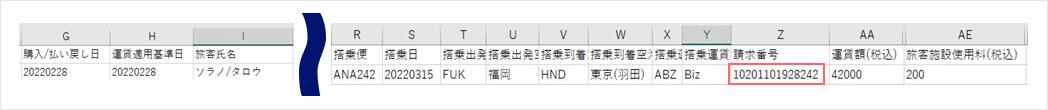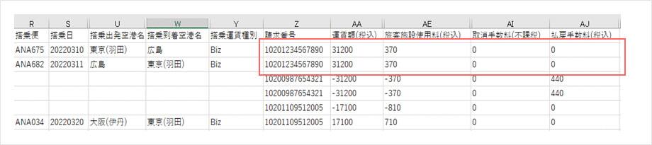 航空券は1区間ごとに記載されるため、2区間以上購入した場合は、複数行にまたがります。
