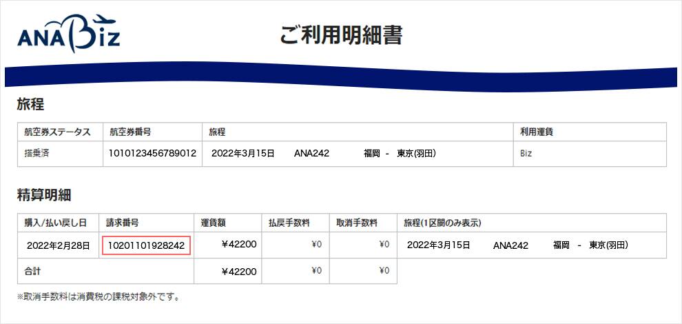 ANA Bizサイトの「精算明細書」や「ご利用明細書」の請求番号(14桁)で、ご利用者や旅程を確認することができます。
