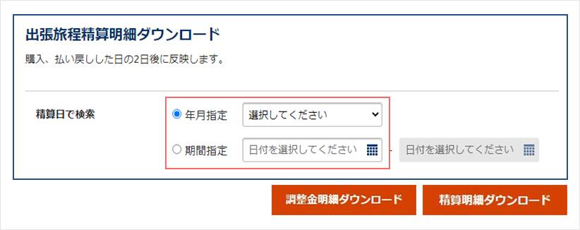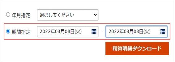 入力)ご利用日(=精算日)を月単位、または、日付の範囲指定で入力し、「精算明細ダウンロード」をクリックします