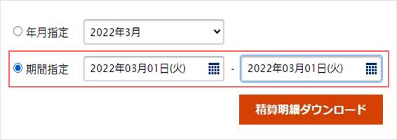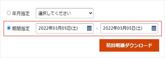 入力)ご利用日(=精算日)を月単位、または、日付の範囲指定で入力し、「精算明細ダウンロード」をクリックします。
