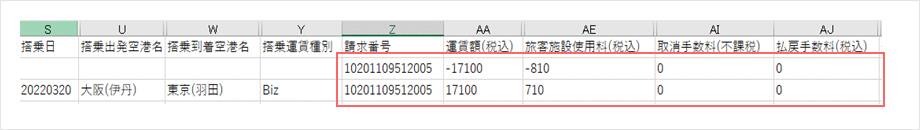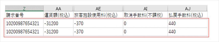AA:運賃額(税込)+ AE:旅客施設使用料(税込)+ AI:取消手数料(不課税)+ AJ:払戻手数料(税込)