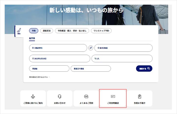 ご搭乗者名やご利用区間、搭乗日、運賃などの情報は、ANA Bizサイトの「精算明細書」 「調整金明細書」 「ご利用明細書」より確認できます。