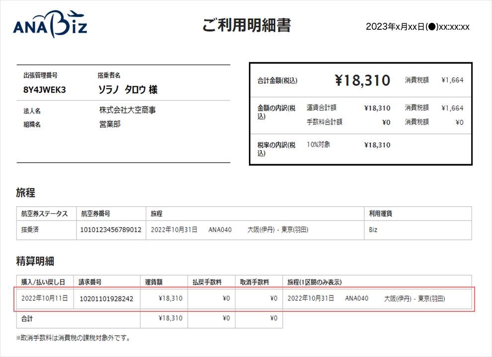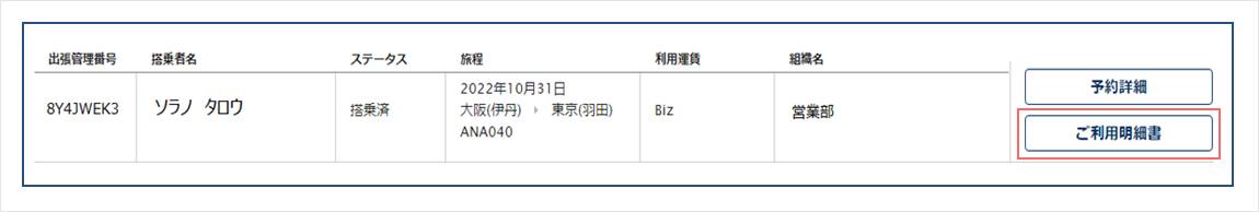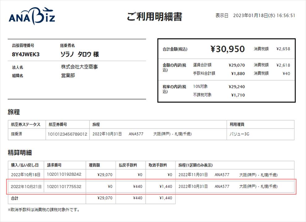 ANA Bizで購入した航空券の運賃や手数料の履歴と合計を出張者様ごとの購入単位で確認することができる明細です。
