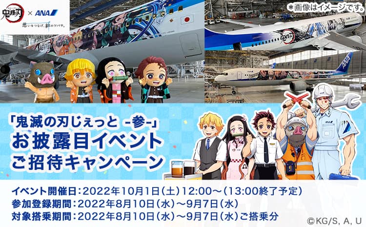 - 2022/9/5 「キャンペーンイベント編」の『鬼滅の刃 × ANAオリジナルグッズ 夏のプレゼントキャンペーン 』は、ご応募期間が終了いたしました。ご応募いただきありがとうございました。