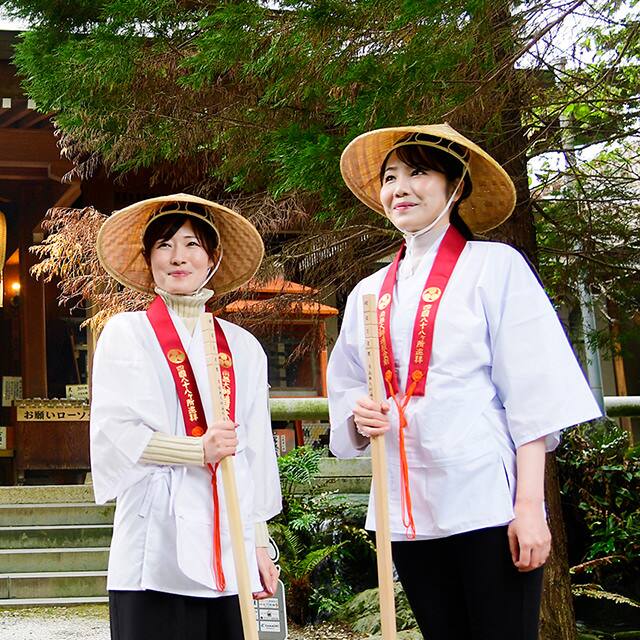 一番札所でお遍路体験!誰でも気軽にお遍路体験ができ、思い出の写真まで撮れる「レンタルお遍路衣装」と、初心者にも安心の「公認先達によるお遍路レクチャー」がセットで楽しめます。納経帳や納め札の巡礼品もそろえていますので購入グッズから作法まで心優しい先達にお気軽にご相談いただけます。