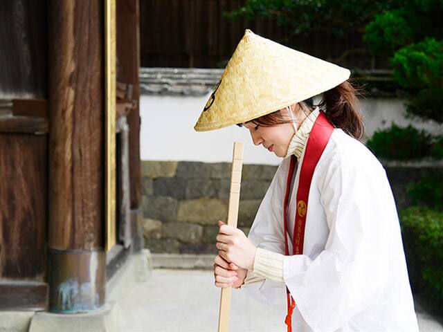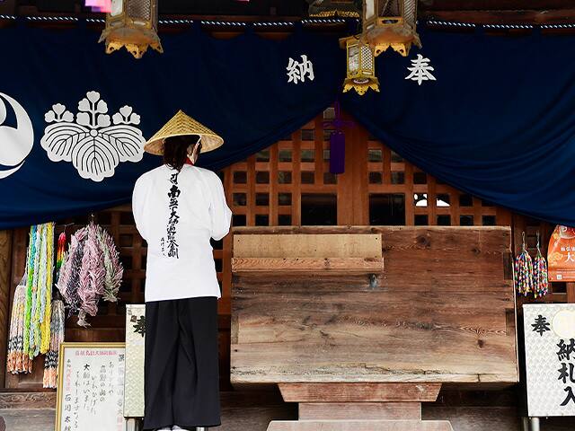 お遍路の旅で着用する正装束。お遍路さんといえば全身を白の衣に包んで旅をする厳格なイメージもありますが、現在はより気軽に洋服の上から白衣を羽織る人も多くいます。