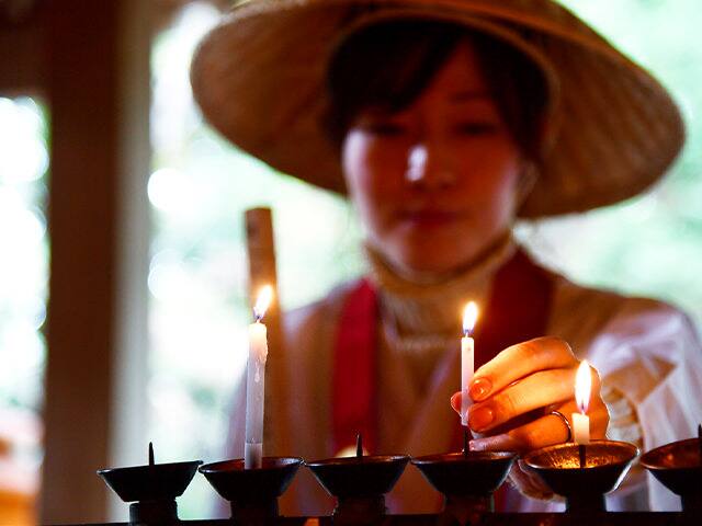 本堂へ進み、持参したろうそく1本を立てます(献灯)。次にお線香を3本立て(献香)、納め札(納札)を1枚納めます。最後にお賽銭をお供えしたら、御本尊の前で願い事を念じ、お経を読みます。