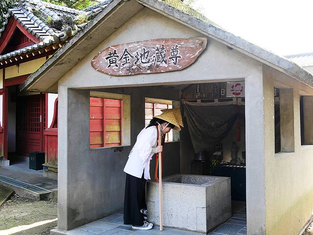 源義経が源平合戦の折に立ち寄った際、家来の弁慶が持ち上げたと伝わる巨石「弁慶の力石」を見ることができます。大師堂の横にある「黄金の井戸」は霊水が湧き出るとされ、金泉寺の名の由来にもなりました。