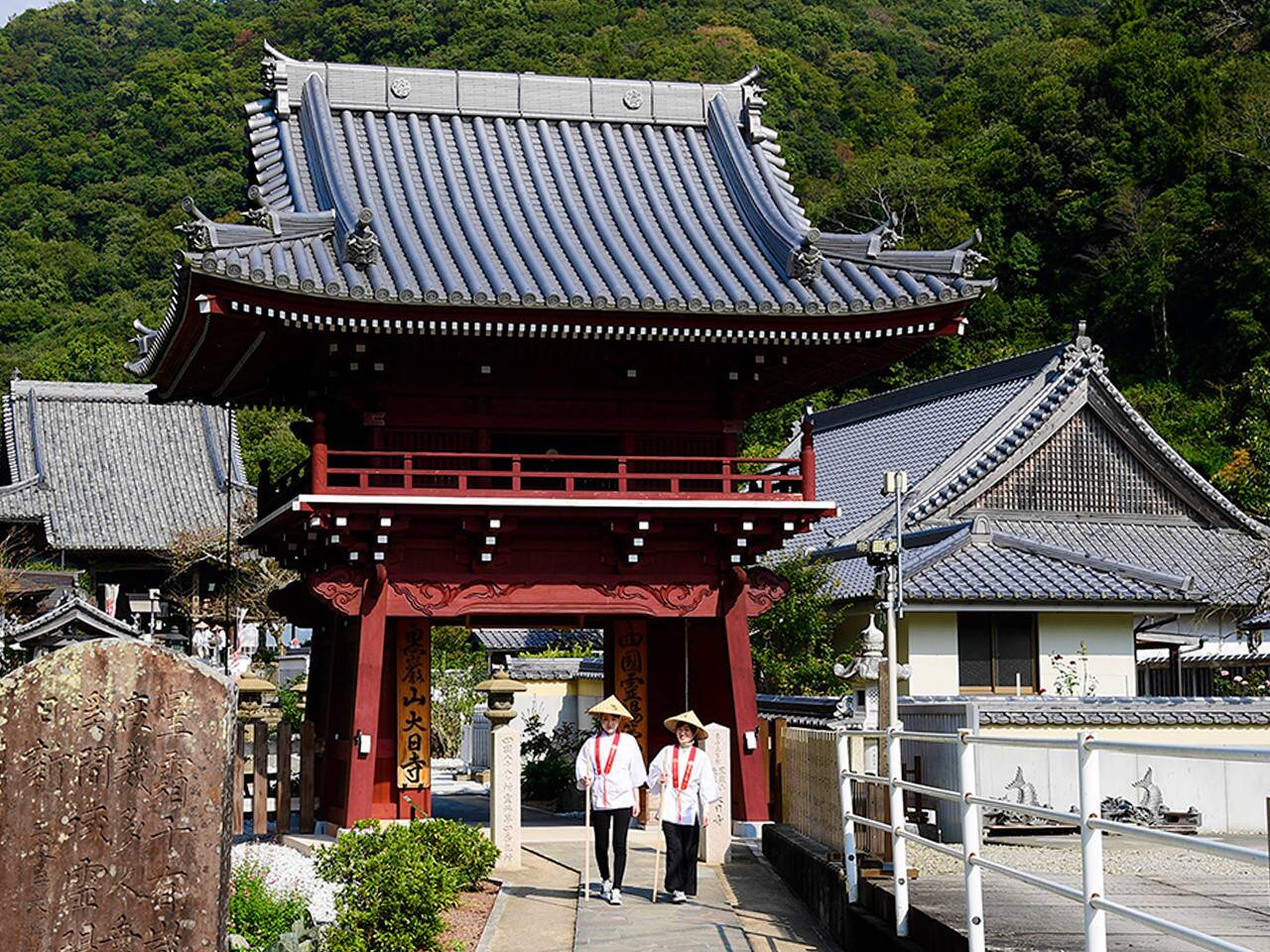 阿讃山脈の尾根に三方を囲まれるようにして建つ大日寺。朱塗りの立派な鐘楼門が自然の中で際立ち、美しい景色をつくりだしています。本堂と大師堂をつなぐ回廊にずらりと安置された三十三観音尊像も必見!