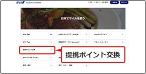 ANAマイレージクラブトップページよりログインし、マイレージナビ内の「マイルを使う」⇒「提携ポイント交換」をクリックしてください。