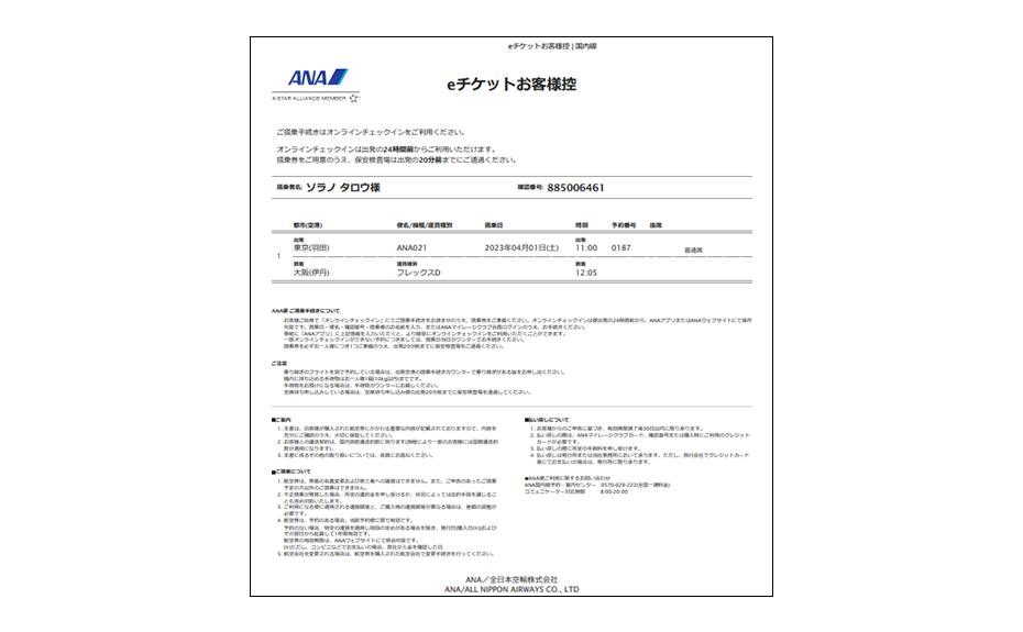 一部空港カウンターで発行されるeチケットお客様控は以下のデザインとなります。