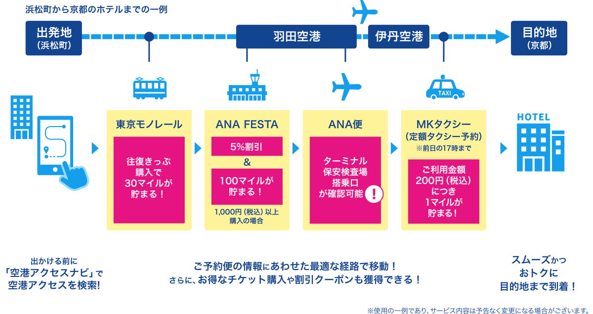 お客様のスケジュールに最適なANA便と地上の移動経路をご案内します(日本国内のみ)。