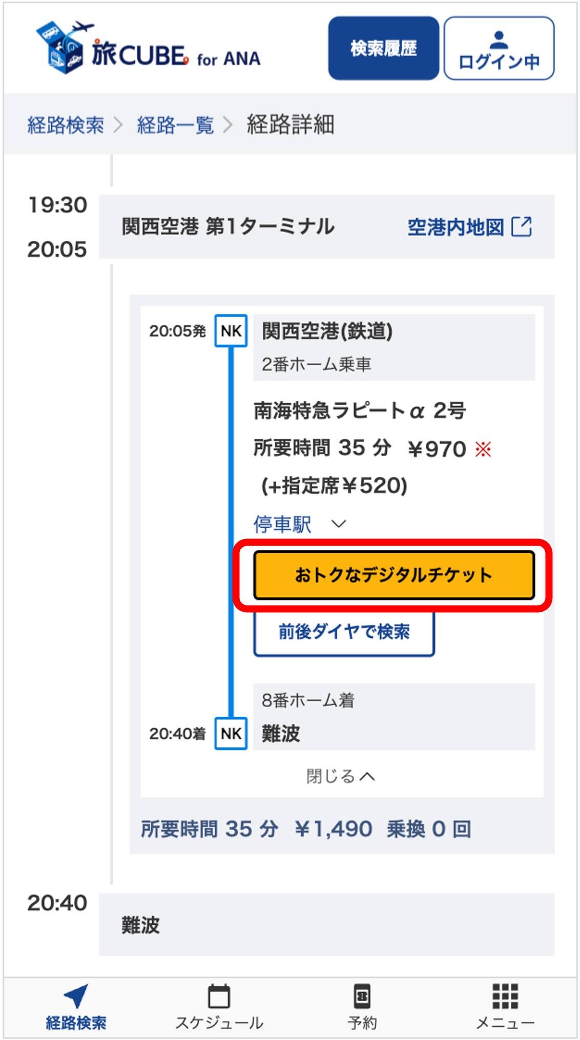 ANA航空券をご予約後、「旅CUBE」*1から検索結果に表示された「おトクなチケット」ボタンをタップすると、南海電鉄「特急ラピートデジタルきっぷ」*2予約画面に遷移しスムーズにきっぷ購入が可能です。