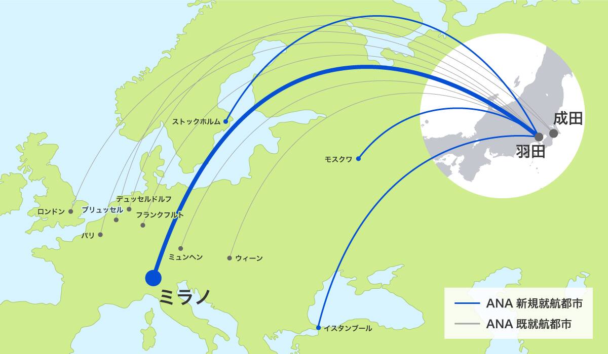 | NH207 | 東京(羽田)00:55 | ミラノ(マルペンサ)06:20 |