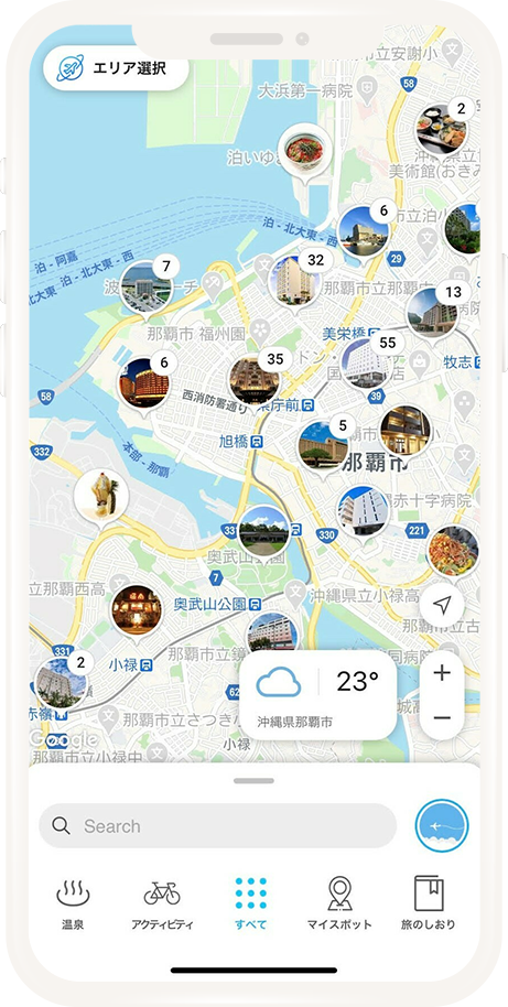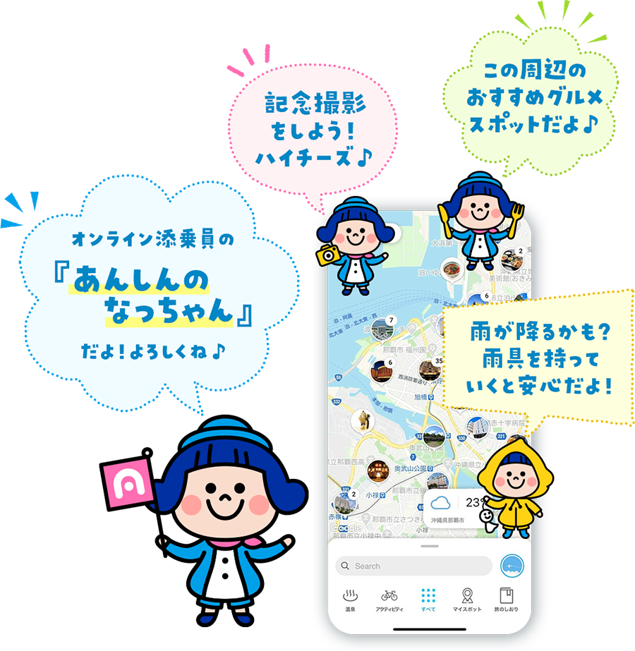地図上にオンライン添乗員が誕生しました!あなたが見ているマップ近くのおススメスポットや天気情報をつぶやいたり、旅のしおりを作成した人には、当日までの旅の準備を呼びかけてくれます。詳しくは実際にA-NAvi(エーナビ)をダウンロードして使ってみてね!